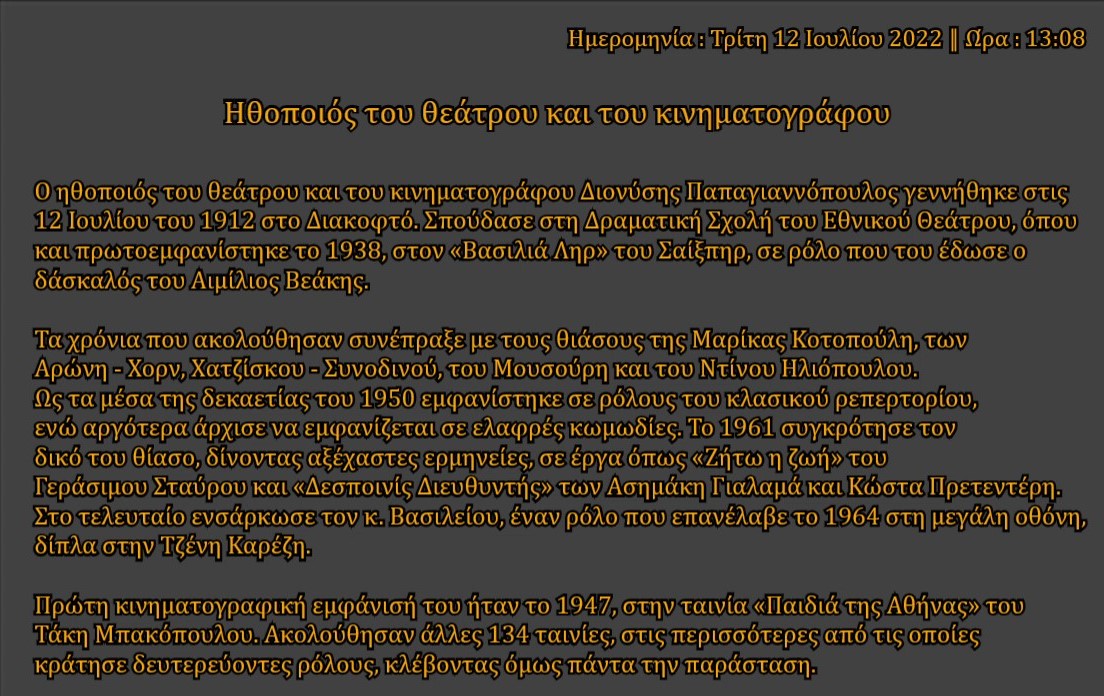 Ημερομηνία : Δευτέρα 15 Αυγούστου 2022 ║ Ώρα : 10:20